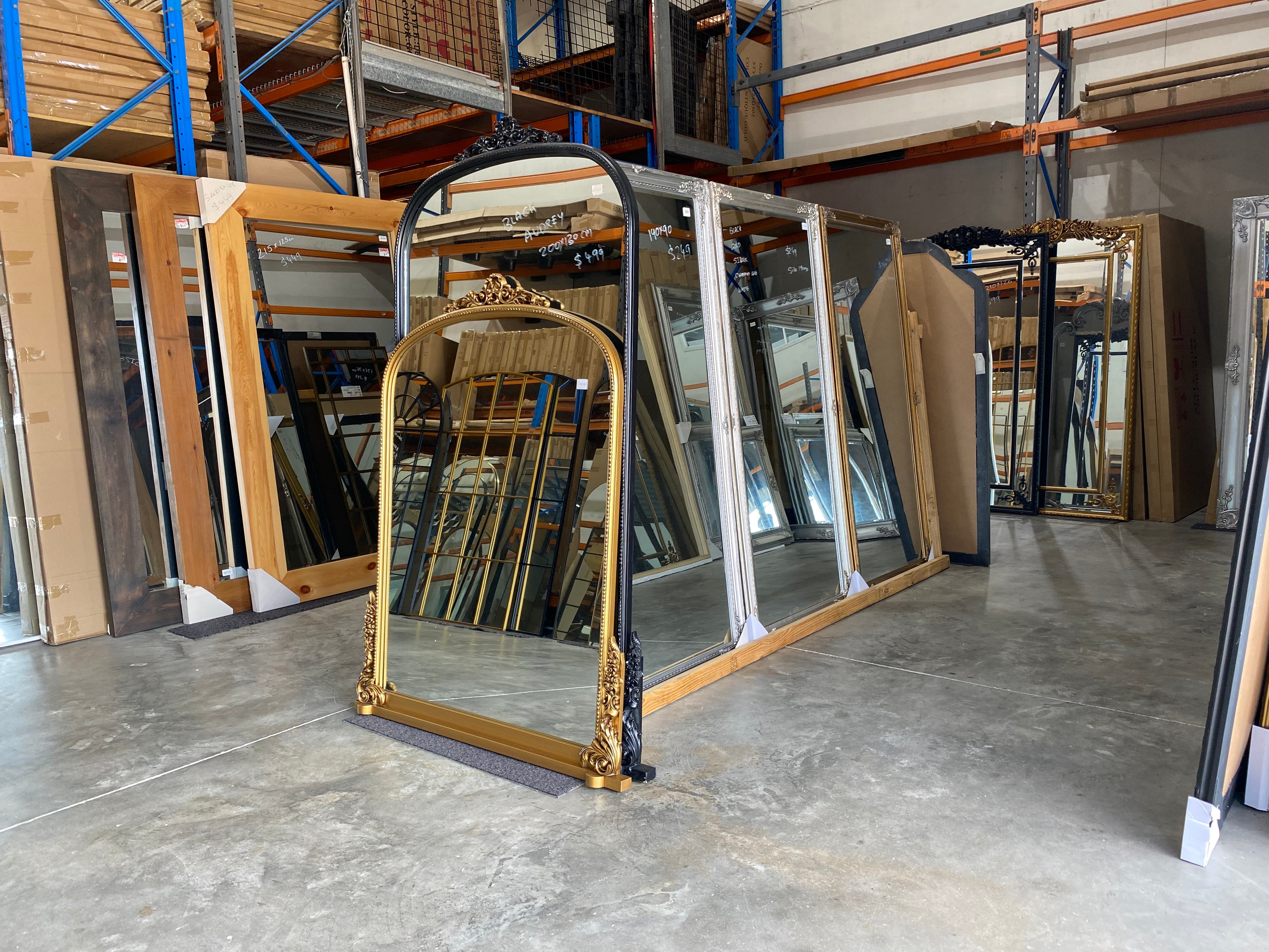 Our warehouse mirror collection includes Arched mirrors, Rectangular mirrors, ornate mirrors, Wood frame mirrors, Oversized mirrors, Full length Mirrors, Decorative mirrors, Gold Frame mirrors, Champagne frame mirrors, Silver frame mirrors, Black frame mirrors, Round mirrors and Entryway mirrors."