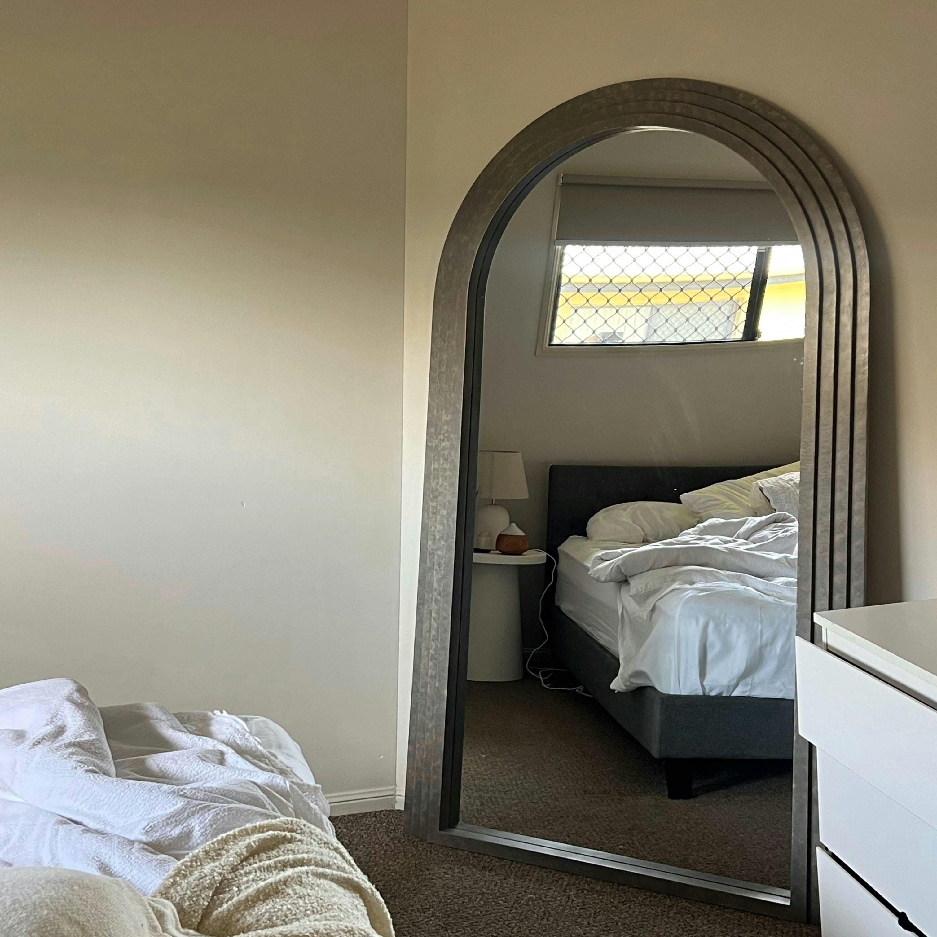 CIARA Large White Concrete Arch Mirror | Oversized Arched Wall Mirror  features a modern aesthetic characterized by its rough surfaces. Ciara By Queensland Mirrors design often incorporates wide arches that create a sense of openness and flow, allowing natural light to permeate the space. The use of white concrete gives a fresh, contemporary look, making it ideal for both residential and commercial settings. Our Ciara style emphasizes simplicity and functionality while maintaining an elegant and sophisticated atmosphere.